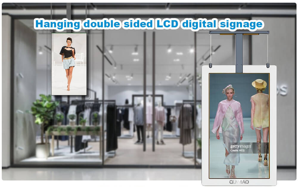 Qunmao factory wholesale double sided hanging tempered glass lcd Advertising display. lcd hanging Advertising display can not rotating 90-degreen, used for shopping mall,retail store,supermarket,restaurant,Business advertising publish.etc.we are Original manufacturer, providing customers with high-quality products and OEM/ODM services. For more information, please contact the Qunmao factory directly.