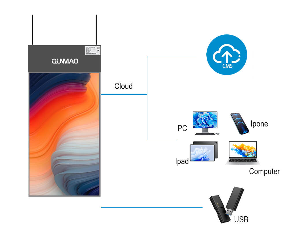 Qunmao factory wholesale double sided hanging lcd Advertising Display. lcd hanging Advertising Display can not rotating 90-degreen, used for shopping mall,retail store,supermarket,restaurant,Business advertising publish.etc.we are Original manufacturer, providing customers with high-quality products and OEM/ODM services. For more information, please contact the Qunmao factory directly.