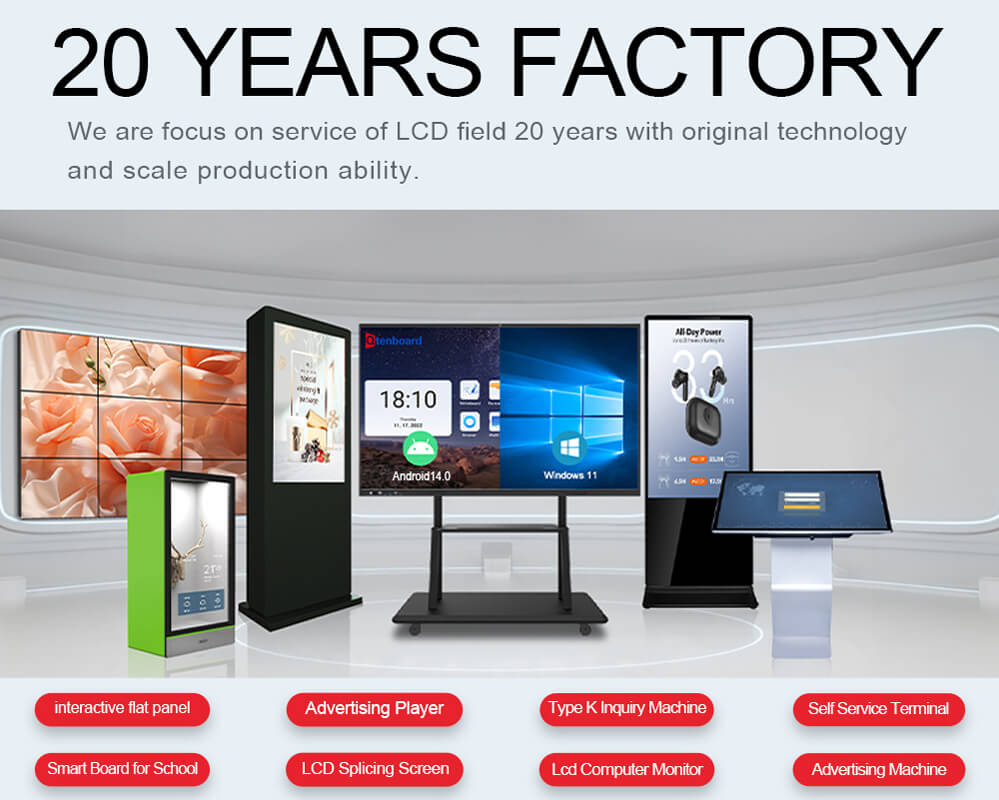 Qunmao manufacturing factory Main prdocuts include :Interactive whiteboard,interactive flat panel,splicing screens, LCD video wall,smart advertising display, smart conference panel, educational tablets, smart blackboards, Digital signage,preschool education machines, smart terminals,queue machine,etc. A high-end technology enterprise with products, it is a master in the field of high-end displays.